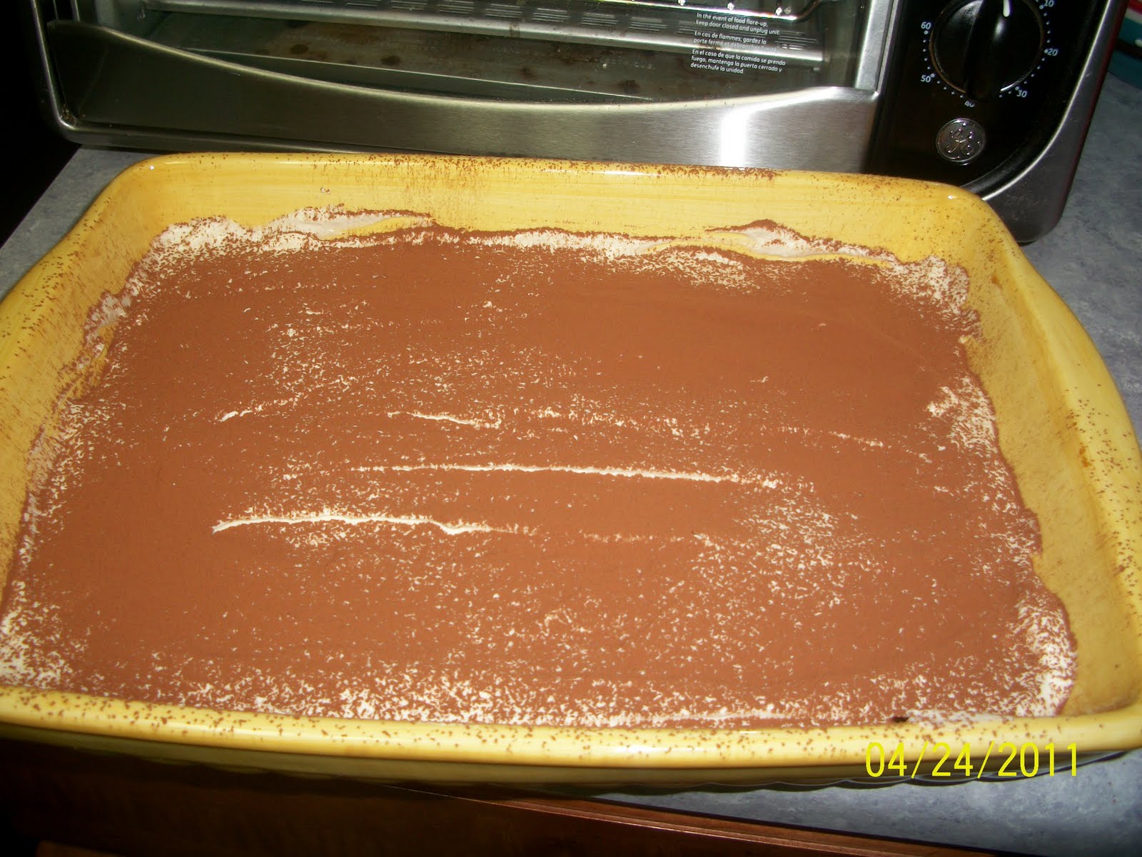4. One by one, dip the ladyfingers in the espresso syrup and arrange a layer in the bottom of a 13-inch x 9-inch pan. (3 rows of 7 across the width worked perfectly, each layer) Spoon a layer of cream over the ladyfingers. Sprinkle some cocoa powder over top of cream. Dip and arrange another layer of ladyfingers over the cream, with the second layer perpendicular to the first. Spoon the remaining cream over the top.